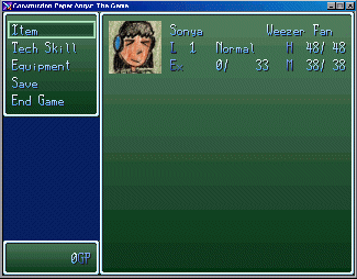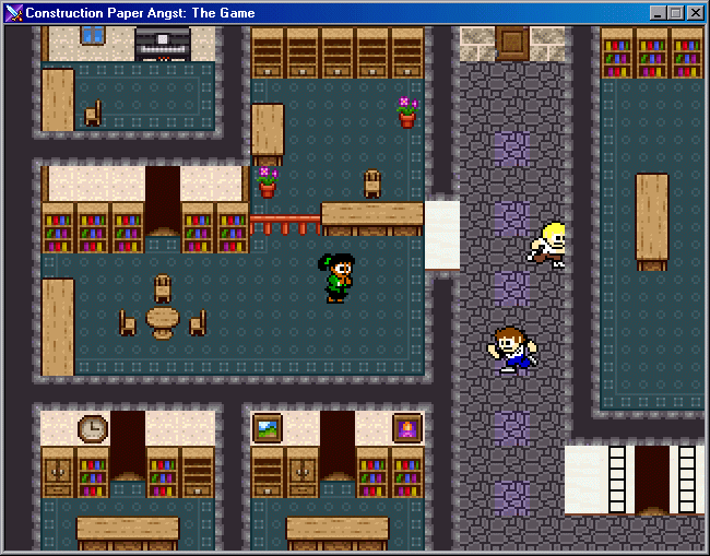 The goal of the game is indeterminate. Basically you play the role of Topher, an angst-ridden teen, and you must assemble a ragtag group of teens as you search Brookings High School for… the point of the game! The game was more of an excuse to play with sprites than a serious attempt at making an RPG. After leaving high school, I found it harder to work on anything with “angst” in the title. I built out the entire dungeon high school and character sprites for Jon, Sonya, and myself. And that’s about it.